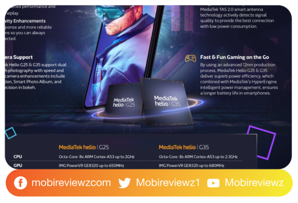 أما عن مُعالج هيليو جي 25 Helio G25 فيأتي بنفس تكوين مُعالج هيليو جي 35 Helio G35 ولكن بسرعة أقل  وهي 2.0 جيجاهيرتز وسرعة وحدة معالجة الرسومات 650 ميجاهيرتز، الفرق الأكبر هو أن هيليو جي 35 Helio G35 يدعم شاشات بجودة 1080p+ بينما يدعم هيليو جي 25 Helio G25 شاشات بجودة 720p+.